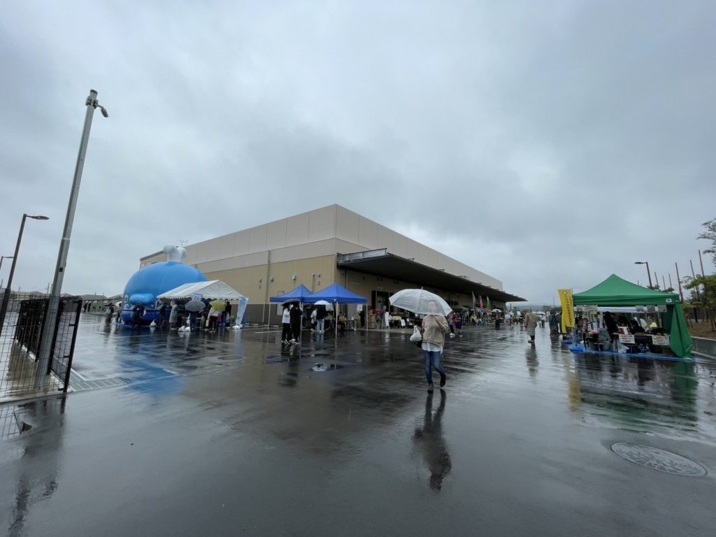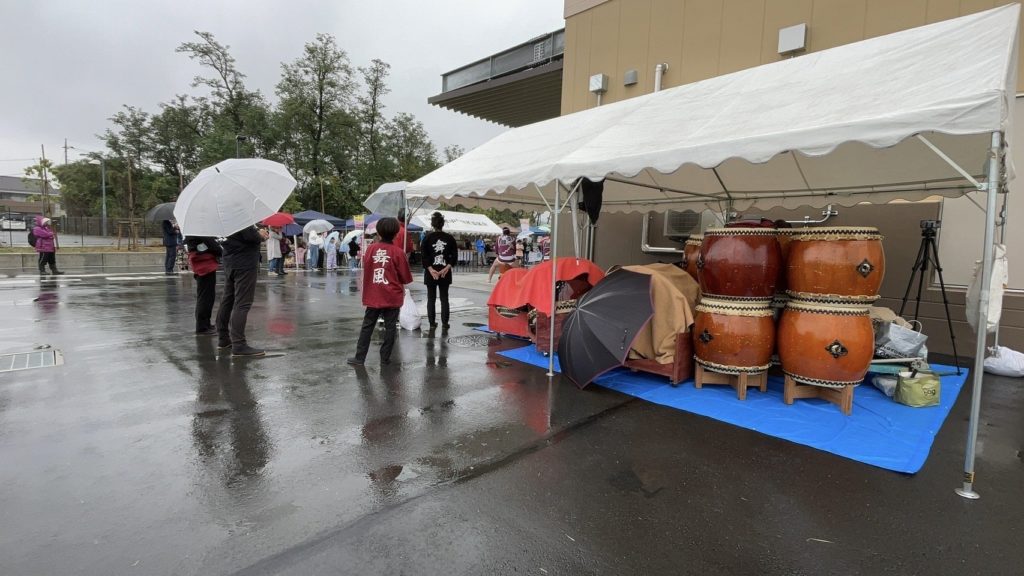 秋祭りになるやまゆり館まつり、今年はやまゆり館の工事のため、新設された給食センターを借りてのお祭りとなりました。ここで『武州今熊太鼓』『関東小鉄太鼓』『和太鼓舞風』の3チームによるステージに参加させて頂きました。イベント自体、駐車場も大きくブースもたくさん出店されていて楽しい会場でした。しかし雨が降りつづけ、中止になった内容もあるので、とても残念な点もありました。